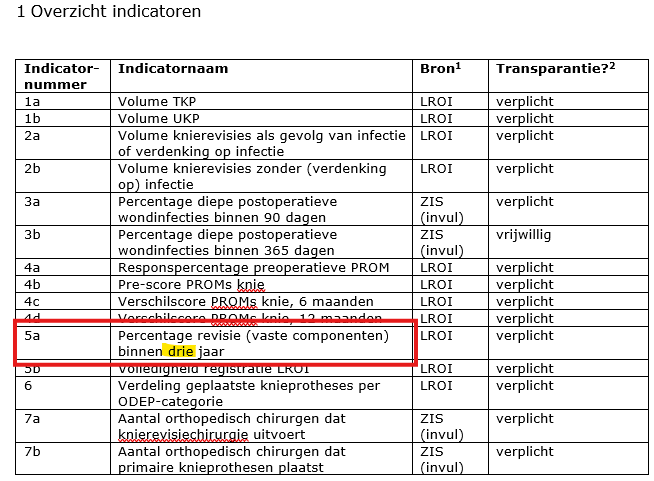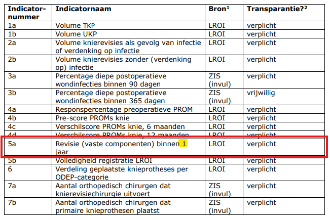 Onlangs heeft het ZorgInstituut een nieuwe gids ontvangen m.b.t. de Knieprothese verslagjaar 2025. In de oude versie was een kleine fout geslopen. Bij indicatornummer 5a was per ongeluk ‘revisie (vaste component) binnen 1 jaar’ geschreven. Dit moet zijn binnen drie jaar. De indicator zelf is niet veranderd. De nieuwe gids is gepubliceerd en vind u op Zorginzicht.nl: Knieprothese indicatoren | Zorginzicht.