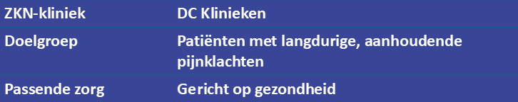 - Een breder portfolio van passende zorg ontstaat niet vanzelf. DC Klinieken werkt hier gestaag aan door de inzichten uit pijnzorg ook te benutten in andere specialismen waar langdurige klachten een rol spelen. Denk aan allergologie, dermatologie, gynaecologie, HIV- en MDL-zorg.